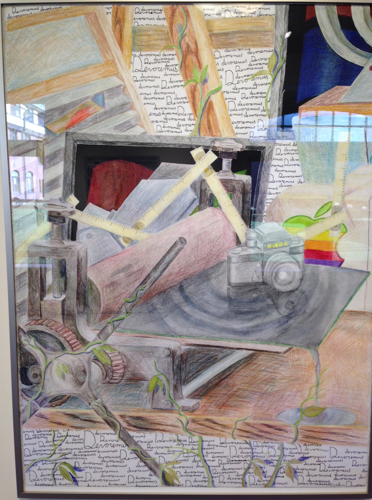 In Art Studio II, students read an article in Harvard Magazine called “The Digitization of the Humanities.” They looked critically at a large still life of objects representing the history of technology, including objects we do not readily associate with today’s lightning speed of information gathering and synthesis. The assignment was to make a drawing from this group of essentially black and white objects using color, line, and surface metaphorically. Choosing what to emphasize and identifying issues and ideas about the role of technology in their lives was a major part of the assignment, and, at times, it became necessary to depart from observational reality to make visible their personal point of view.We are reminded that today’s technology is built upon a history of tools, of patterns of thinking, and of inventions that solved problems and measured with precision. Designers today program computers that make 3D machines which then make machines. Within this context of change, a pencil remains a valuable responsive tool and means of communicating ideas giving a viewer marks of the human hand and mind.