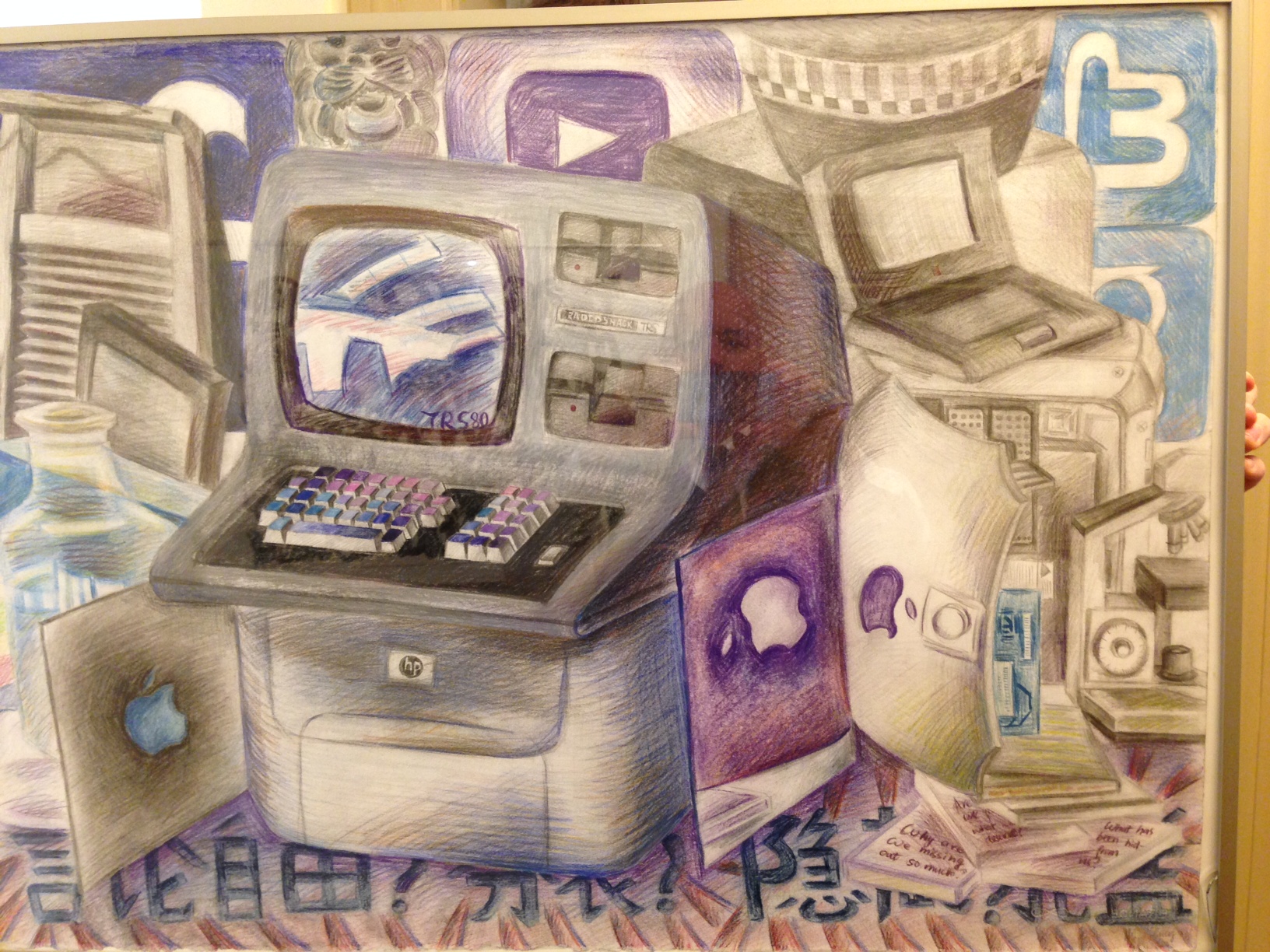 My very first idea about this drawing was to express a sense of the mystery of technology by using a series of colors like blue and purple and use pencils to describe some other parts of my drawing. As I went on in my drawing, I also learned a lot about perspectives, reflections, and different color choices. I realized that using only blues and purples would make my drawing look too “cold.” I decided to add more warm colors, like brown, red, and orange, into my own country’s technology with my drawing. The government of China has blocked a lot of websites, such as Facebook, Twitter, YouTube, and Google, for political reasons. I drew the logos of those websites underneath my objects as a background to indicate that those websites are not fully accessible. However, I didn’t put something like crosses over the logos because apparently there are ways for us to go onto those websites despite the government’s attempt to hide them from us. The text on the bottom of the page means freedom of speech, separation, and hiding. First, the government doesn’t want us to go on those websites because they don’t want some words or rumors on these websites to cause separation among certain provinces in China. This represents how the government is not giving us freedom of speech and is hiding information from us. The red lines around the text make the words more like a command from the government. In this drawing, I made a lot of personal breakthroughs. I learned how to express my own voice in a drawing instead of just reporting what I saw. I also learned how to build colors with layered color pencils. A few things I need to work on are choosing a wider range of colors and applying techniques of building colors to my drawing.