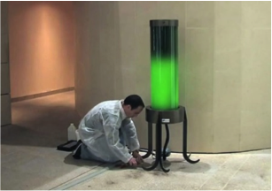 Since childhood, Calleja was fascinated with aquaculture and life out in the sea. As he slowly blossomed into an intelligent and creative scientist, he experimented until he found the enormous potential of micro-algae to reduce the greenhouse gas effect. With the micro-algae, he envisioned a means of creating a mutual relationship between the algae organism and humans. This watery-glass-tube lamp that Pierre created not only provides emission free light, but, when placed in populated areas, also rids the area of harmful carbon dioxide. This innovative product utilizes the algae’s natural ability to complete photosynthesis. The micro-algae use the carbon dioxide that we emit. Compared to a 50-year old elm tree that takes in about 123 pounds of carbon dioxide, the micro-algae are able to absorb about a ton of carbon dioxide per year. The lamp essentially takes the byproducts of burning fossil fuels, humans’ exhalation, and our use of machines to produce oxygen and also provide light behind a curtain of algae.