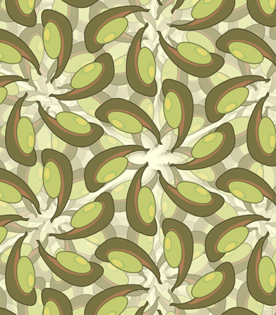 Symmetry does not only exist in molecular structures but also in crystalline structures. Crystals have an ordered internal arrangement of atoms. This ordered arrangement displays internal symmetry. For example, the atoms are arranged in a symmetrical fashion on a three dimension network called lattice. Besides internal symmetry, there are three types of external symmetry a crystal can possess: rotation, reflection, and inversion. The rotational symmetry of crystals is further discussed. Rotational symmetry also exists in many wallpaper design as illustrated in the following images.
