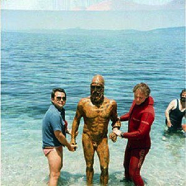 Mariottini (on the left) stands with one of two life-size bronzes he discovered while snorkeling. Retrieved from http://classics.olemiss.edu