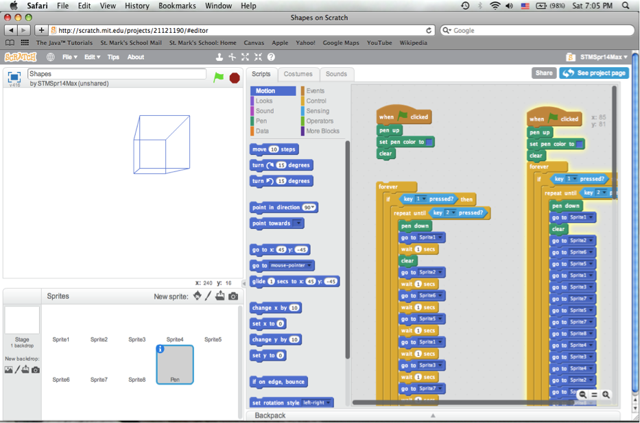 When I signed up for Robotics in the fall semester, I had never taken any class involved in computer science. Although we were mostly focused on designing and building robots, we did enough programming to let me know that I enjoyed it. In this spring semester, I am fortunate to be taking Computer Science. My teacher, Mr. Roche, introduced us to programming through Scratch, a simple, visual, and object based language that is run by MIT. What makes scratch so appealing is that it does not have any of the confusing syntax of more advanced languages, meaning that it is easy for beginners like me to pick up. I have created many projects in Scratch, but there are two specific ones that I would like to share.