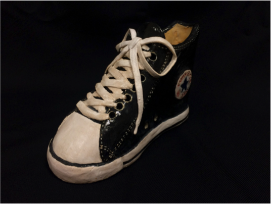 4) Converse Sneaker. Much like the fox, this project took a good amount of time and patience. I felt that a Converse sneaker was a challenge that I could take on, and Ms. Belt supported the decision. To make it, I made three large slabs of clay and connected them using the scoring and slipping technique. In a way, it felt as though I was the seamstress actually making the shoe out of fabric, except it was clay, a much less forgiving material. Ms. Belt and I had many conversations over the shoe laces, which I ended up making out of very thin strings of clay. Glazing was fun, considering I could have gone overboard with colors because, as a brand, Converse is all about self-expression. However, I stuck with the black to keep it simple and classic.