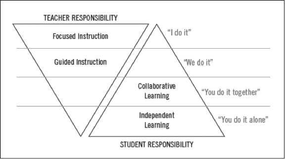 In November, our Patterson consortium for blended learning[1] attended the iNacol Symposium[2] and in my first session I was introduced to a new paradigm for teaching and learning. Though it made sense immediately as a set of distinctions I was already making, seeing the visual depiction of our time was helpful for me in understanding how students and teachers can together approach course material and assessments. In his session centered around project-based learning, Andrew Miller shared with us an image presented by Douglas Fisher and Nancy Frey in Better Learning Through Structured Teaching[3]: