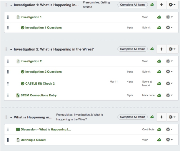 The introduction of the curriculum has received mixed feedback from students and faculty. The major complaints have centered around the time it takes to develop the seemingly simple concept of Ohm’s Law, the use of non-conventional vocabulary to describe concepts, and the challenge of giving efficient feedback in response to student activities. Students often report a fatigue factor with the style of the curriculum which requires a large amount of independent meaning making from a diverse set of observable phenomena. In response to this feedback, the Canvas LMS was used to create a blended approach to CASTLE, and a concept test was used to collect objective data on the effectiveness of this method of instruction.