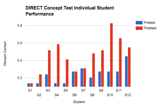 In analyzing the results of the DIRECT concept test, all students answered more or the same number of questions correct on the posttest. Three students showed no gains in concept knowledge, but anecdotal comments after the pretest indicated that many students had never seen any of the material on electricity and had guessed on most of the questions. Cross-referencing the questions each of these students answered correctly on the pretest and posttest showed there were no similarities across both tests. This suggests that the questions these students answered correctly on the pretest were guesses, and thus their scores should really have been 0%. In each case, zeroing the pretest scores resulted in an average gain similar to the class average.