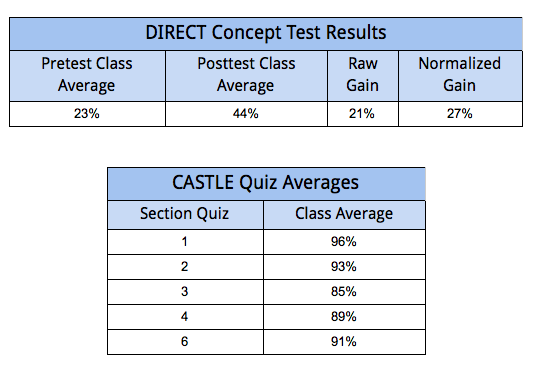 The percentages shown for the DIRECT Concept Test are the percentages of questions correct. The raw gain is the difference between the pre and posttest averages. The normalized gain attempts to correct for the very low pretest scores. The percentages shown for the CASTLE Quiz average are percentages of points received out of the total. Point values were assigned to the questions on the CASTLE quizzes in as binary a system as possible. The questions were either right or wrong, and only 1 point was awarded for a correct answer. On questions that required explanation or more than a single answer, a rubric of important words or phrases was created that earned students points. These important words or phrases were taken from the study guides provided to the students before the quiz was taken.
