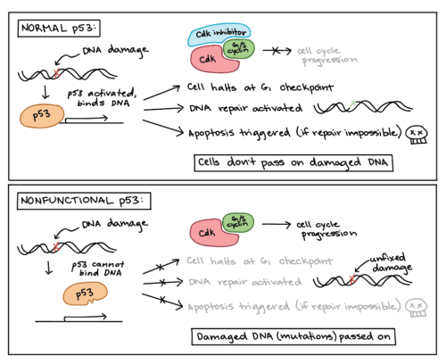 Unregulated cell division causes the mutations to spread. When there is a defective tumor suppressor gene, especially p53, a cell with damaged DNA may proceed through the stages of the cycle, ultimately dividing. The daughter cells will inherit more mutations due to the unrepaired DNA of the mother cell through the division of cells. Cells with defective p53 tend to accumulate mutations. The function of p53 is to detect mutations and make the cell fix the mutations, or cause the cell to undergo apoptosis. As a result, proto-oncogenes can become oncogenes or deactivate other tumor suppressor genes within the cells, thus passing on damaged DNA (Figure 9).