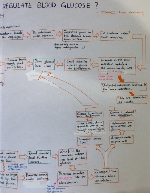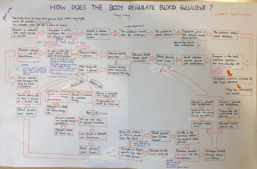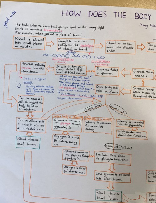 It can be challenging to understand the complex physiological mechanisms and pathways we explore in Biology. One effective strategy to synthesize, organize, and review information is through visual thinking. We employ visual thinking in a number of ways. In this assignment, students were charged with constructing a flowchart to illustrate their current understanding of how carbohydrates are metabolized.