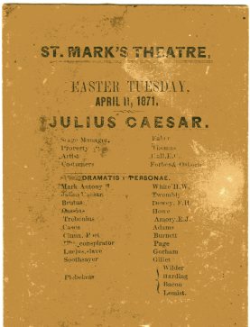 discovered what may be the last surviving program from that day, packed away in a box in the eaves of the current history wing. Handling that 140-plus year-old document, set in a small, decaying frame, started me thinking about the long tradition of Shakespeare study and performance at St. Mark’s, in which I had played a small part during my Third Form year.