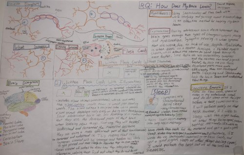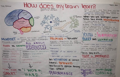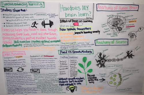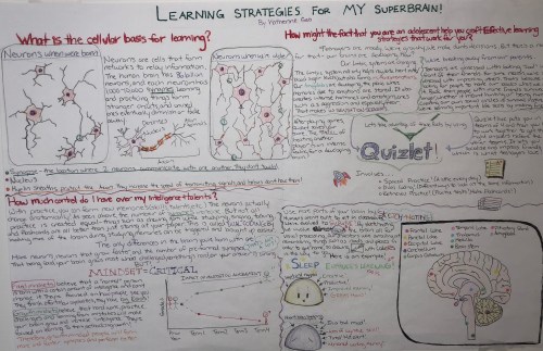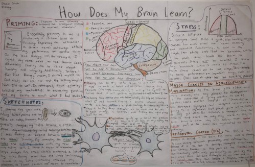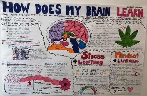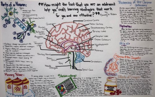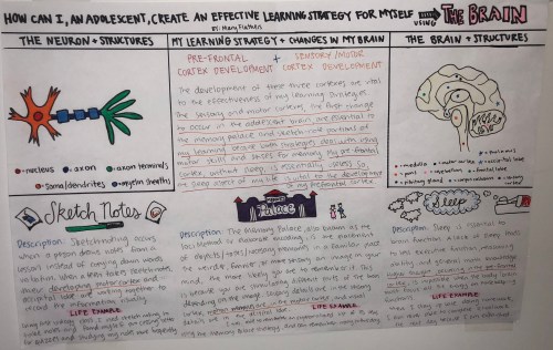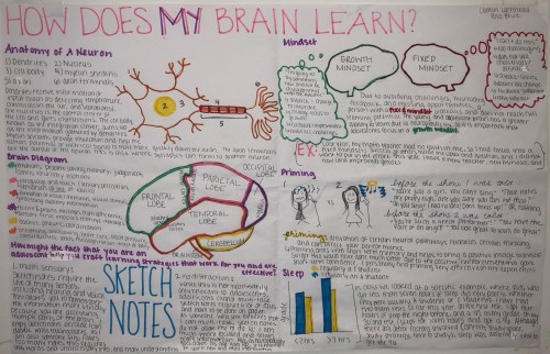 Editor’s Note: In the culminating assignment of the Biology 30 unit on Learning and the Brain, the students created Annotated Diagrams of their brains and how their brains learn new information. An Annotated Diagram is a formal sketchnote that aims to demonstrate understanding of the information by demonstrating how the information was processed. The following question was posed: “How might the fact that