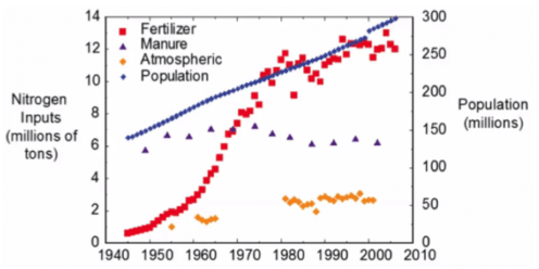 The increase in the use of fertilizers has a direct correlation to the human population growth in the United States since 1940s. From 1940 to 2010, population in the United States more than doubled in size, beginning from 132.2 million people and growing to 308.7 million people. With more people to feed, farmers and agricultural businesses must accommodate by growing food at a faster rate, thus requiring more fertilizers to trigger more plant growth in a shorter amount of time. The fertilizers used by farmers contain nitrogen and phosphorus. Since nitrogen is a key component of the plants’ chlorophyll molecules and phosphorus is a part of the nucleic acid structure of plants, these two nutrients are needed to sustain healthy plant growth. The direct correlation between population growth and use of fertilizers containing nitrogen and phosphorus since 1940 is shown in the graph below from the United States Geological Survey.