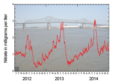 Noting the increased use of fertilizers containing nitrogen and phosphorus, scientists have conducted research to evaluate trends of nutrient levels in marine environments in order to determine other causes of nutrient pollution. Reported by the Watershed Nutrient Task Force in a 2015 Report to Congress, a study was conducted in which nitrate levels of the Mississippi River was recorded over a period of three years. Based on the results, it can be seen that nitrate concentrations have seasonal patterns.