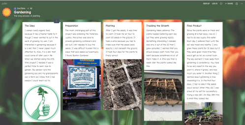 I did not like doing the project proposal mainly because I ended up doing something much more different as I went deeper in my research. My original idea was to grow snap peas in a pipe that was cut in half. After that I would write an article and hopefully publish it in an environmental online newspaper. I ended up being able to borrow soil and gardening containers from the school. My public product was a Padlet that I made explaining the process of my 20% time. So my public product was a lot different from my original idea.