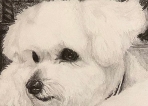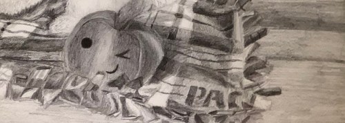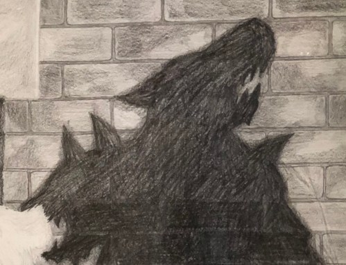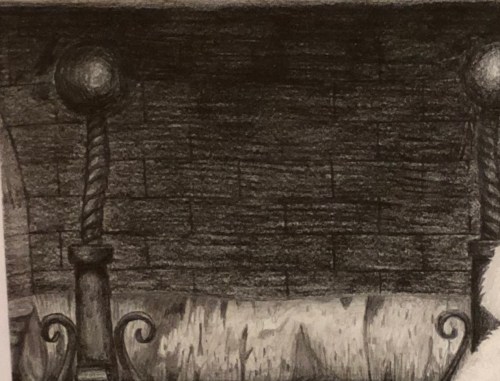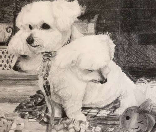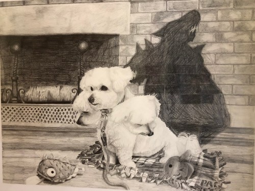 This pencil drawing is one of many pieces I am making for my concentration in Studio III. In my concentration, I am focusing on mythical creatures in the modern world. For this particular piece, I chose the idea of drawing the Greek mythological creature, Cerberus, but with a modern twist. I made the dog cute and fluffy and set him on a soft blanket with his toys near a fireplace. I wanted to make the whole composition seem cozy and welcoming, which is the opposite of what Cerberus in Greek mythology is like. The shadow of the dog, drawn with dramatic, harsh lines, is a reference to the true nature of Cerberus: scary and foreboding, which contrasts with the cuteness of the dog, drawn with soft, careful lines. I purposely chose this composition because I wanted to show that mythical creatures can evolve into what we want to see them as. Personally, I enjoy the idea of having a cute three-headed dog rather than a scary one, and therefore in my perspective, Cerberus looks like the dog in the piece.