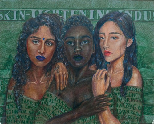 The three women in the artwork are Yanusha Yogarajah, Nyakim Gatwech, and Jella, who are all beauty influencers celebrating dark skin. Drawn as standing in solidarity, their confrontational gazes ask us, “What will you do about colorism?”