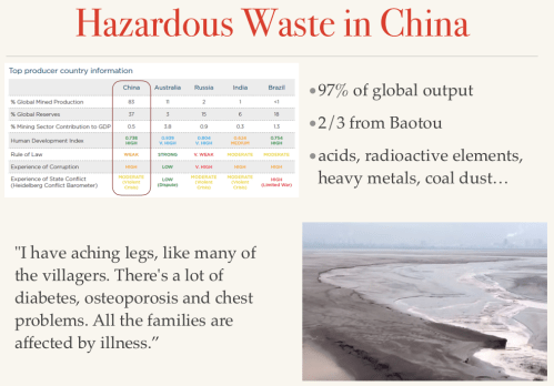 As mentioned, the concentration of rare earths in the ore is very low, so they must be separated through techniques like acid baths. The waste water lake in Baotou contains acids, radioactive elements, and heavy metals from processing and mineral residues.