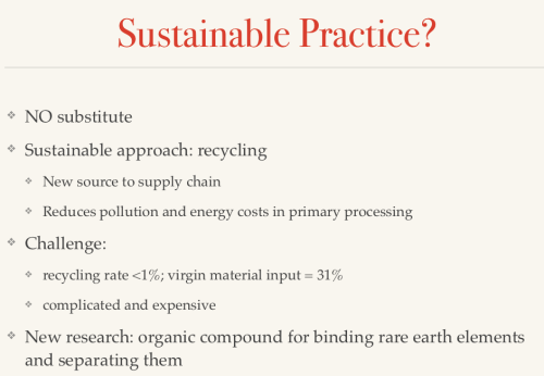 Practices that might be altered to make Y less problematic: Recycling could be a more sustainable way of using Yttrium. It not only adds a new source to the supply chain, but also alleviates environmental and energy burdens in primary mining and separations. Since Y has a low depletion rate, it has high potential to be recycled from electronic waste. Currently, Yttrium has a recycling rate of <1% and virgin material input of 31%, which indicate inefficient recycling. This is because Yttrium is a small part contained in a complex system, and requires recycling processes that are complicated and expensive. However, a recent project at the University of Pennsylvania has designed a new, cost-effective approach to recycle Yttrium. The team developed a new organic compound for binding rare earth elements and separating them. It provides new hope for Yttrium recycling.