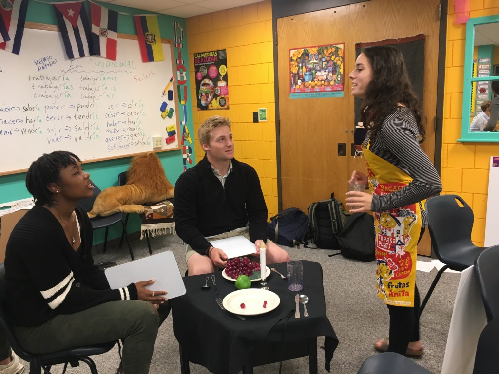 In turn, the Spanish that is used also seems more authentic because I try to make it relevant to their lives. We frequently start out talking in the circle and the hook or attention getter is something that someone has brought into class or something that is going on in the school. I try to make it as real-life and pertinent to what they are experiencing on a day to day basis as I can. When the mother of one of my students, Sierra, visited for a Family Weekend conference and saw the picture of her daughter working at the classroom restaurant, she said, “She told you that she has a job at a Colombian restaurant over this summer, right?” Sierra had not told me that, but I was head over heels happy to hear that she would actively respond to customers who would tell her, “Este plato es para chuparse los dedos. ¿Qué más me recomienda?” (Trans. “This dish is finger-licking good. What else do you recommend?”) and “¡Guacala! ¡Qué asco! ¿Me puede traer algo diferente?” (Trans. “This is gross! Can you bring me anything else?”) just like we had acted out in class.