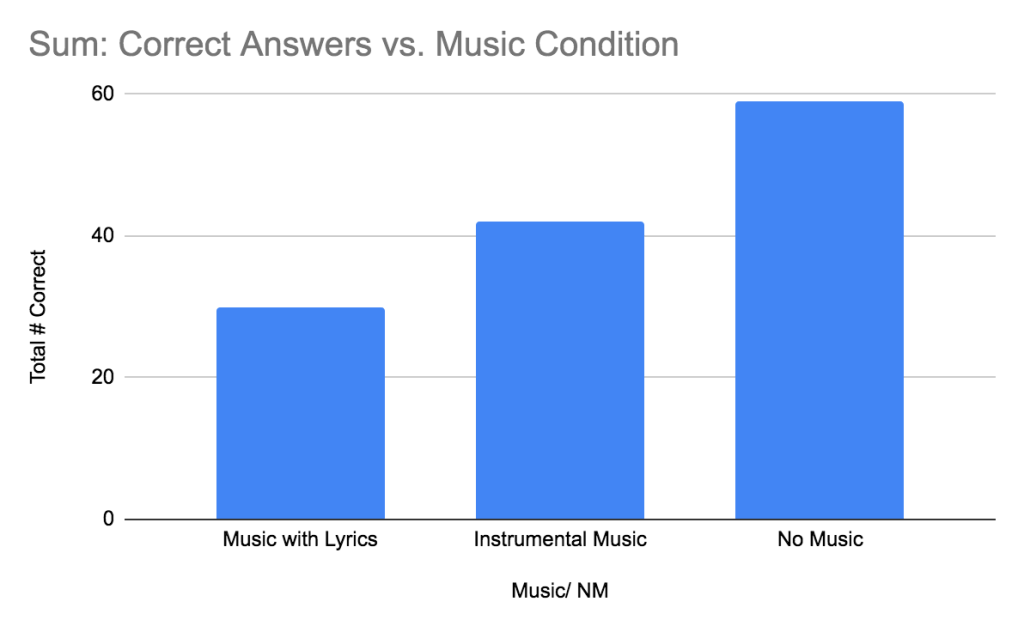 Our results show a clear trend: participants who did not listen to music had a higher number of correct answers than those listening to music with lyrics and those listening to instrumental music. The average amount of correct answers for the group that listened to music with lyrics was 7.5, for instrumental music it was 10.5, and for the no music group it was 14.75 (Figure 1). This indicates that listening to music while completing a verbal task interferes with the student’s level of concentration; however, no music will not impede their ability to complete the task. Most of the participants who listened to music with lyrics claimed that the song lyrics interfered with mental word processing, so they understood the influence of music on completing verbal tasks. Those who did not listen to music while completing the task said that the silence helped them concentrate rather than being distracted by background noises like music. Most of the participants who listened to instrumental music claimed it had little to no affect on their performance.