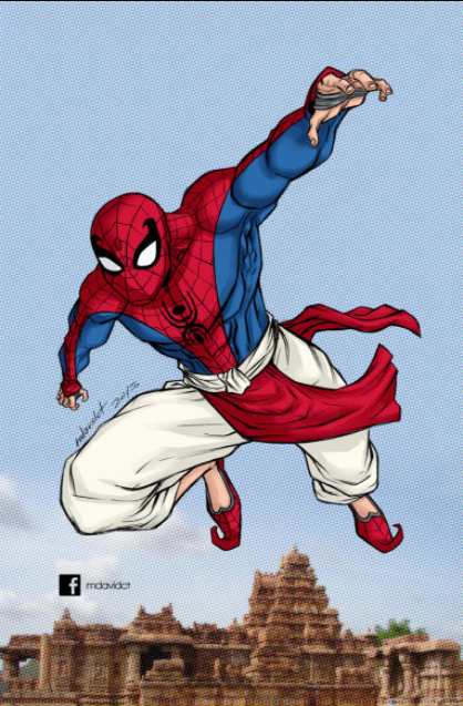 With regard to Spider-Man, in particular, the Webslinger has been adapted through various mediums, appearing in television cartoon series, feature films, video games, collectible action figures and toys since his inception in 1962. Most recently, and following the commercial success of the first Spider-Man movie in 2002 (directed by Sam Raimi), the U.S. based publishing company Gotham Entertainment Group (licensed in India) announced that they were teaming up with Marvel Comics to print the four-part miniseries called Spider-Man India for Indian and American audiences. In what Gotham Entertainment has called a “transcreation” of the Spider-Man mythos, Peter Parker of New York City has been reinvented as the Pavitr Prabhakar in Mumbai. Along with his name and location, Pavitr’s appearance has likewise been altered: he now wears golden hoop earrings, has darker skin with long scraggily sideburns, and sports a dhoti both in and out of costume. In addition, Peter Parker’s closest family and friends Uncle Ben, Mary Jane, and Aunt May have been revised as Uncle Bhim, Meera Jain, and Auntie Maya. [2]