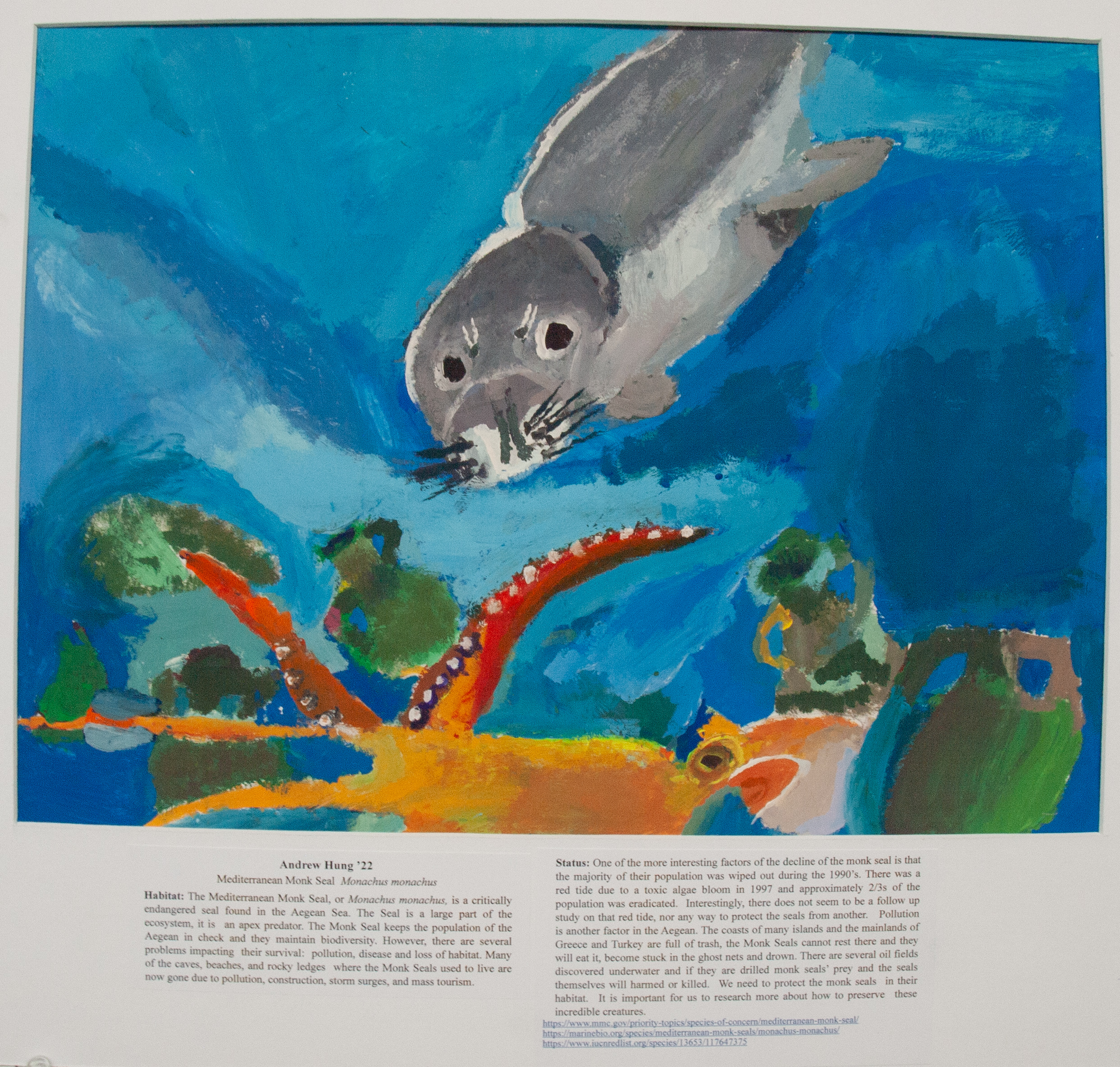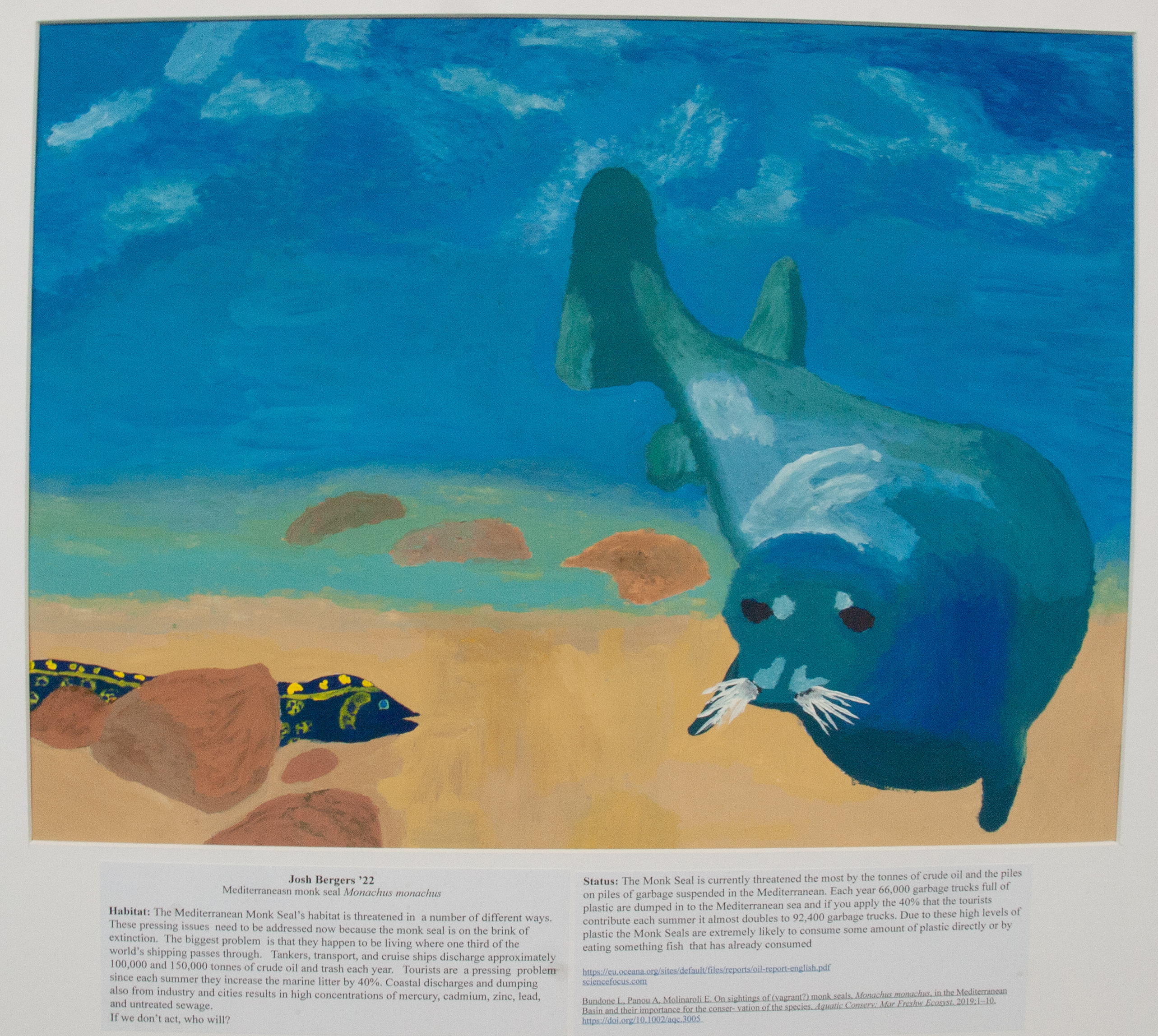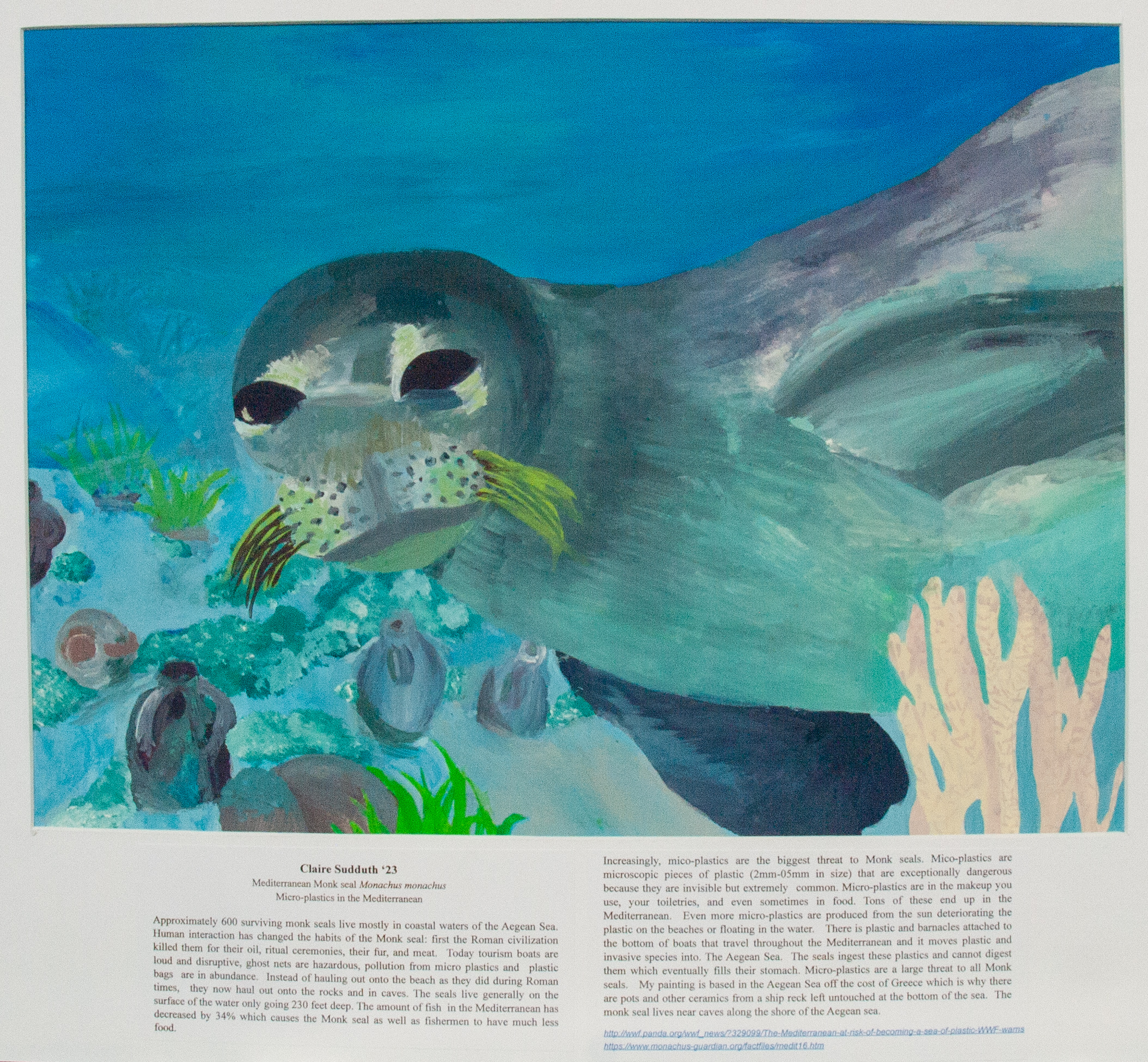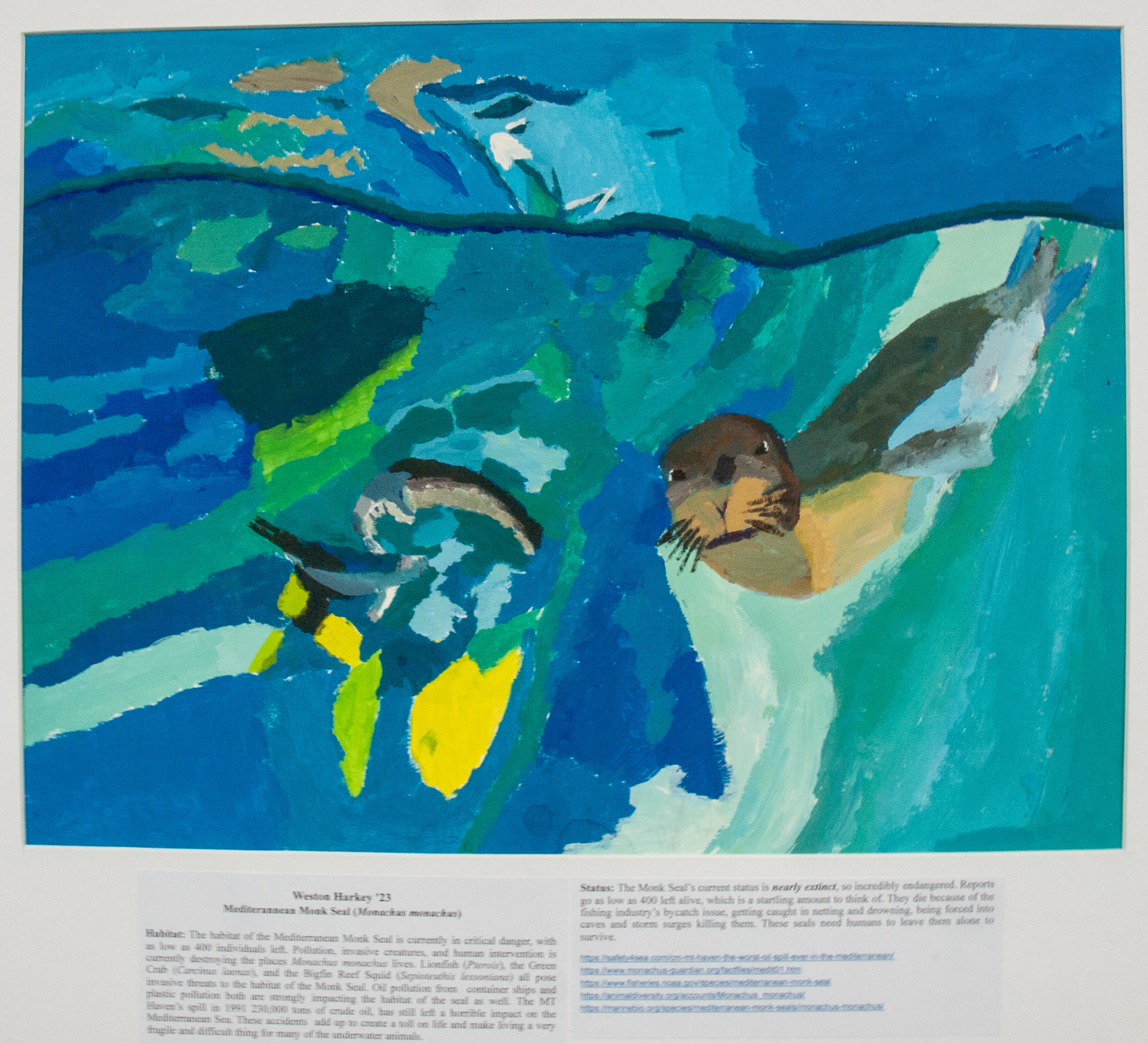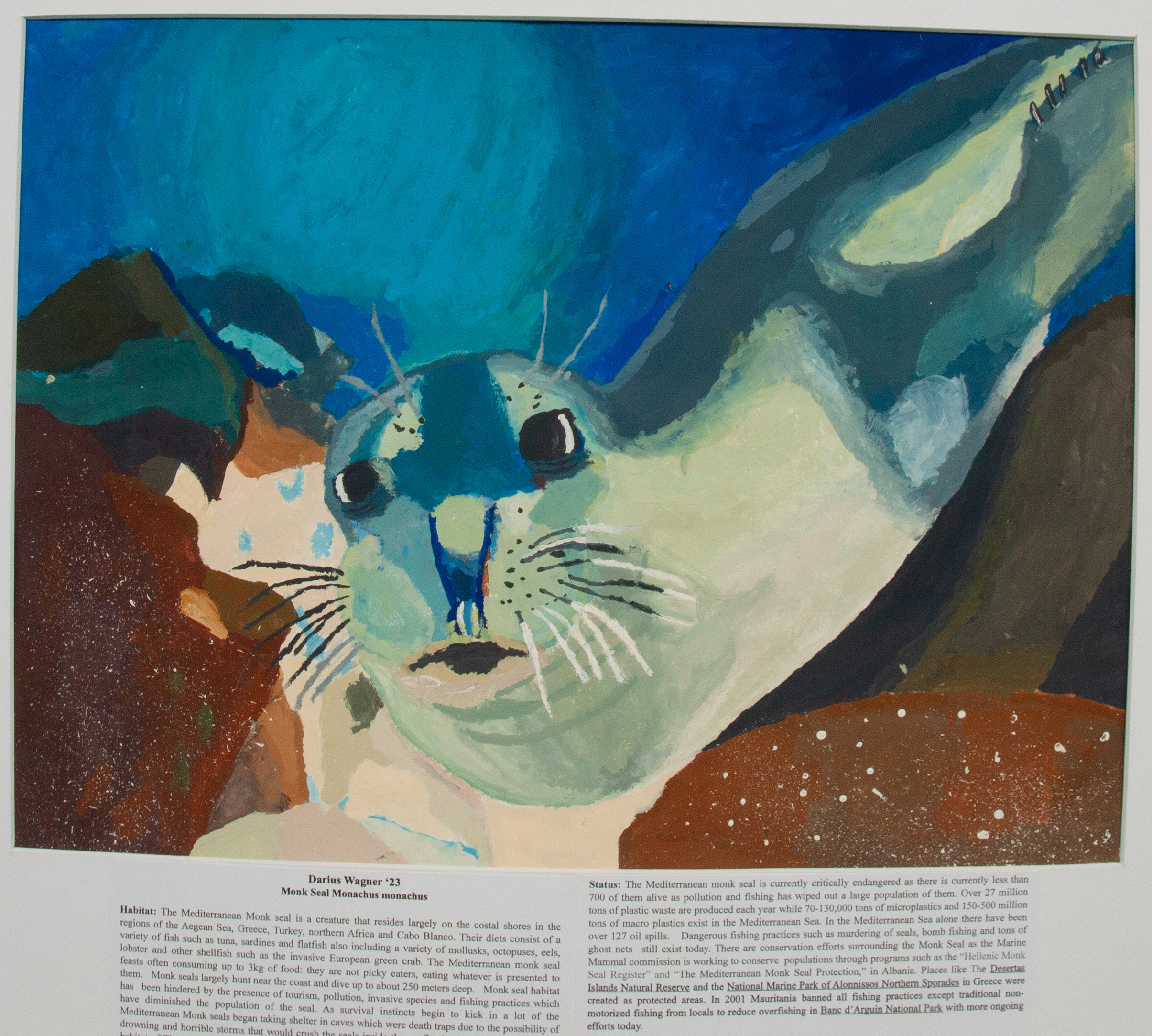 As a class we give profound thanks to Dr. Bundone because he had faith in our work and his passion for his own life’s work encouraged us to be better artists, students and humans. Dr. Bundone’s studies brought realism and accuracy to our work by answering specific questions for information about the Mediterranean monk seal to help us convey the ongoing situation occurring in the Mediterranean. The additional presence of scientific study inspired us as artists to create very accurate and informational pieces focusing on every angle, every shadow, and matching every color. We have had our fair share of struggles translating details from sketches to paint, conveying specific colors, finding how to make the presence of a shadow known, and blending colors. When our climate crisis seems less important than anything else, my generation must deal with these problems as those in power now ignore the scientific evidence. It is in our hands to make sure we have a future.