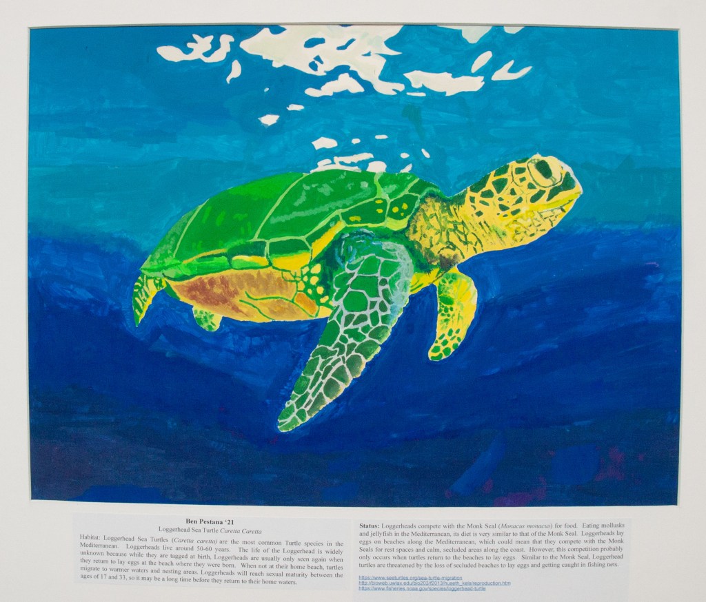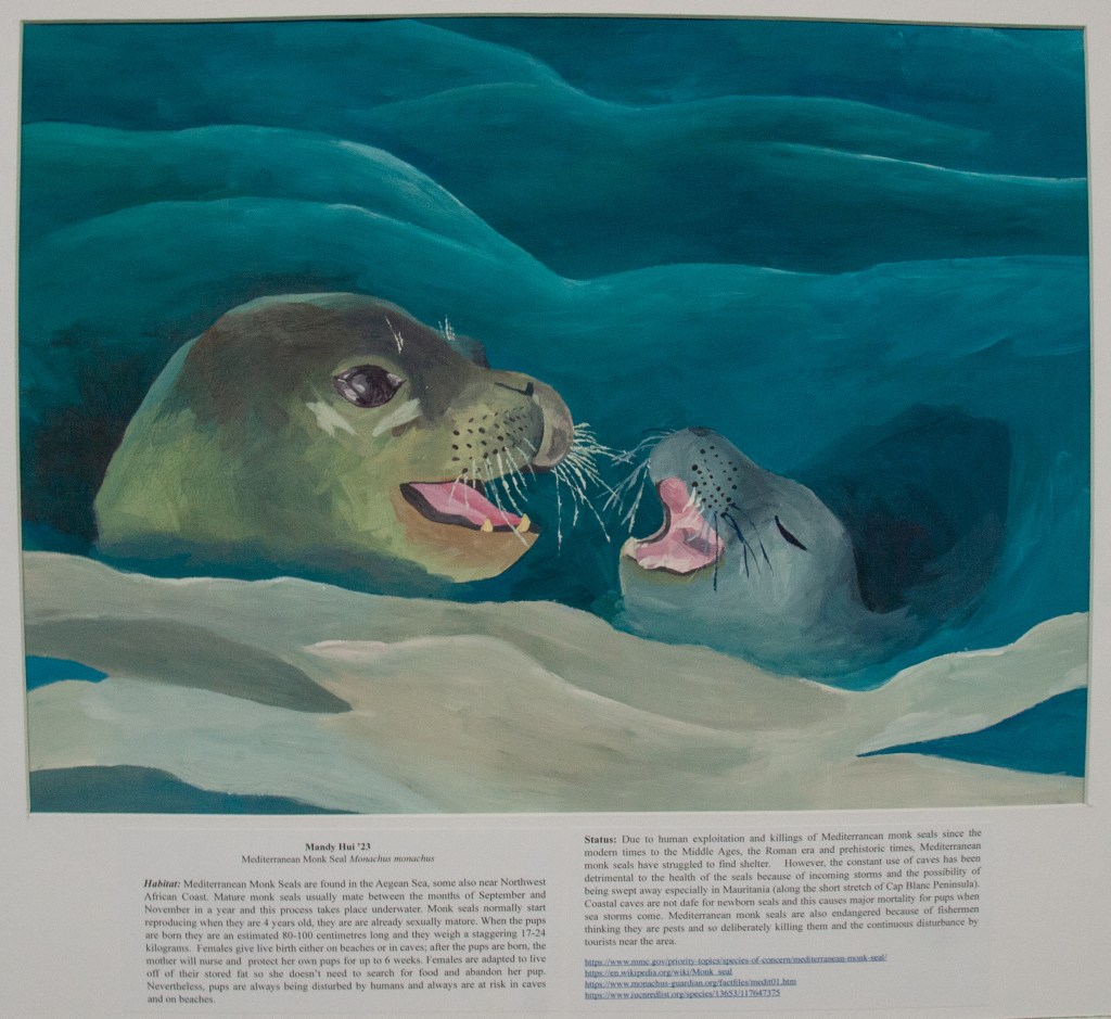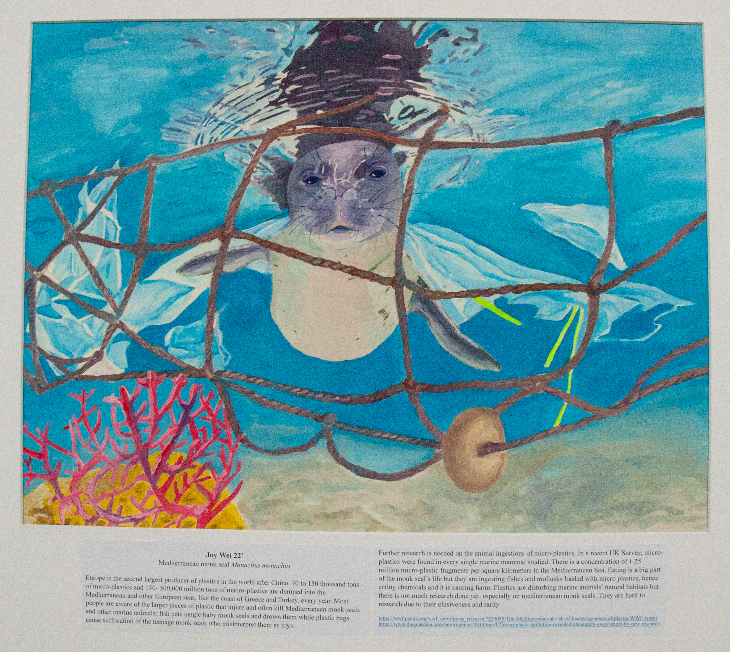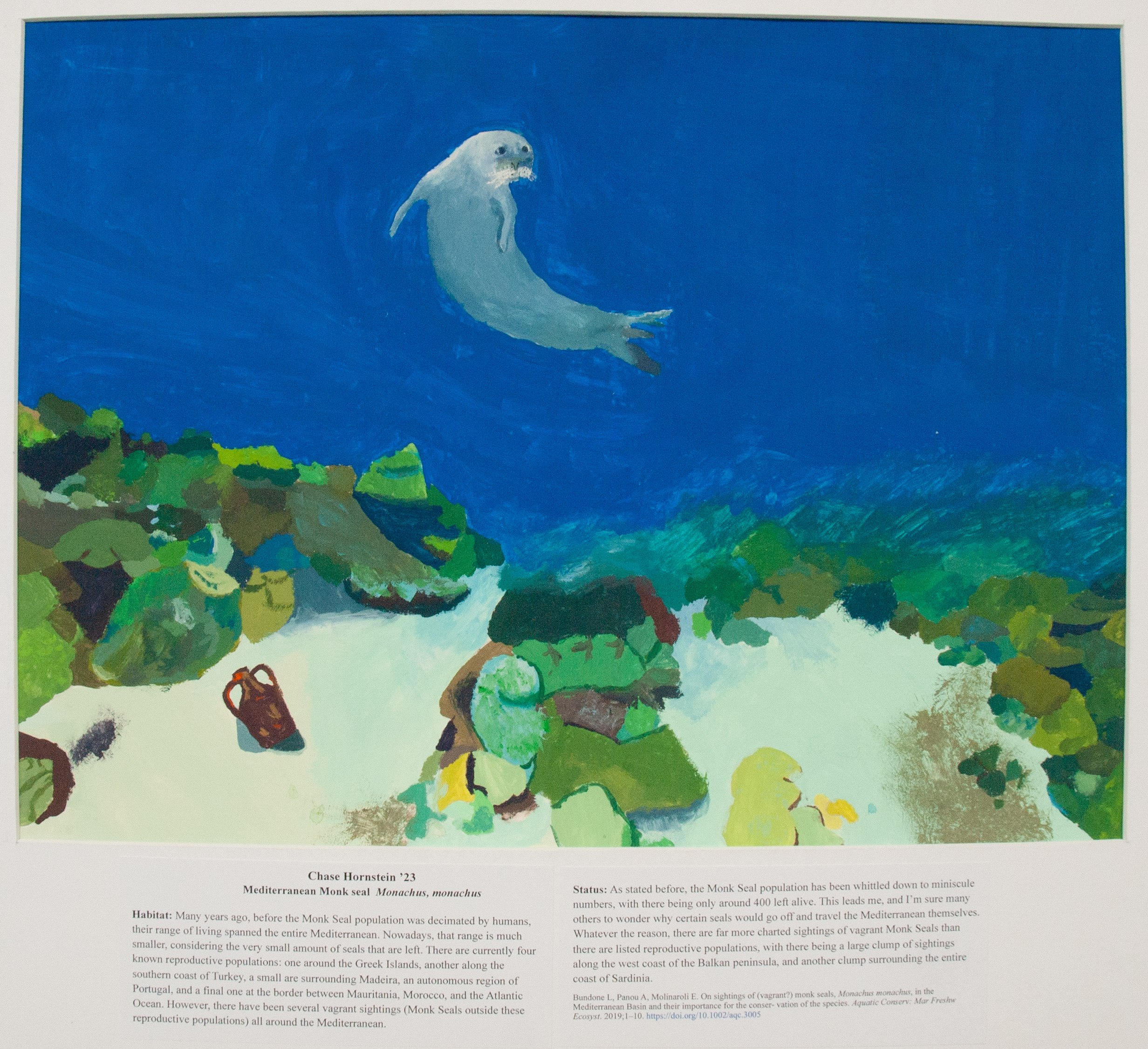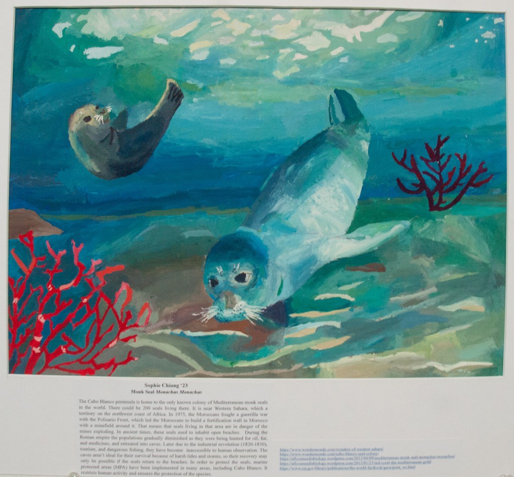 As a class we give profound thanks to Dr. Bundone because he had faith in our work and his passion for his own life’s work encouraged us to be better artists, students and humans. Dr. Bundone’s studies brought realism and accuracy to our work by answering specific questions for information about the Mediterranean monk seal to help us convey the ongoing situation occurring in the Mediterranean. The additional presence of scientific study inspired us as artists to create very accurate and informational pieces focusing on every angle, every shadow, and matching every color. We have had our fair share of struggles translating details from sketches to paint, conveying specific colors, finding how to make the presence of a shadow known, and blending colors. When our climate crisis seems less important than anything else, my generation must deal with these problems as those in power now ignore the scientific evidence. It is in our hands to make sure we have a future.