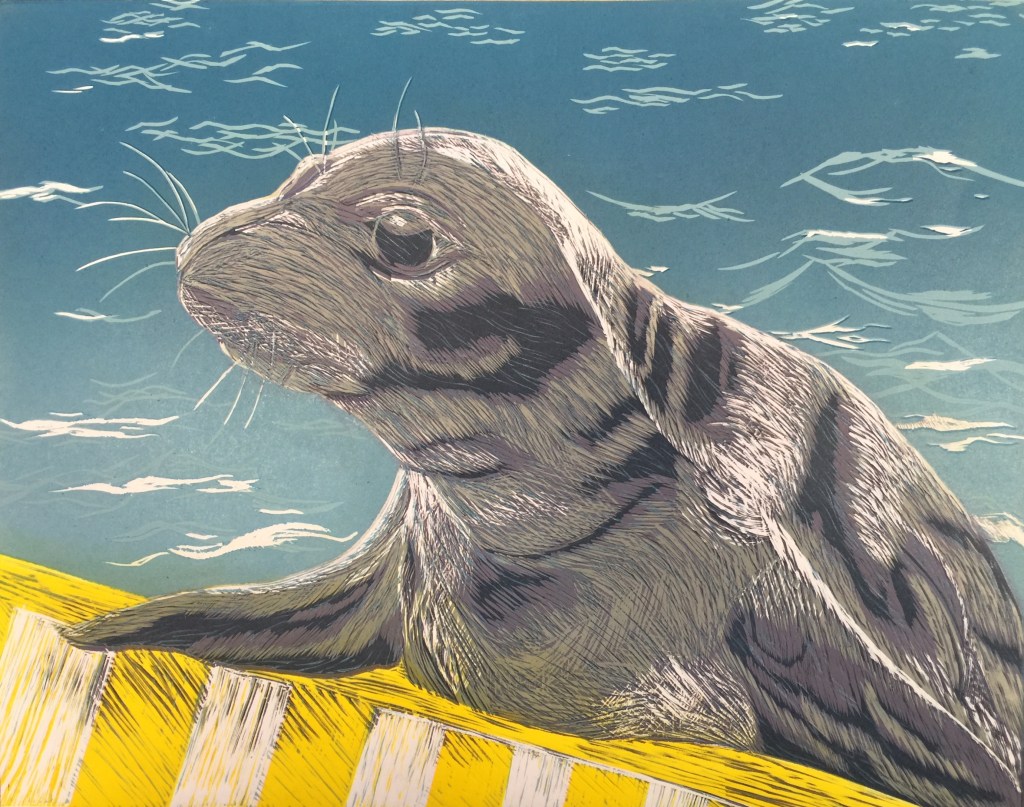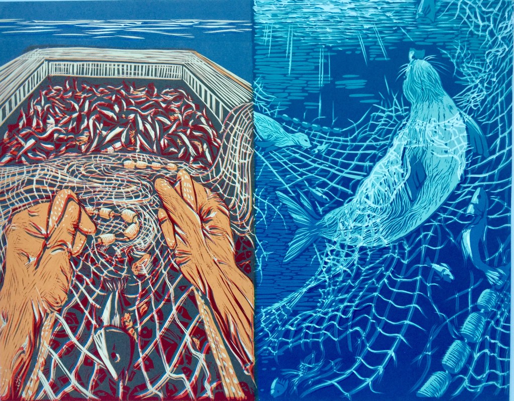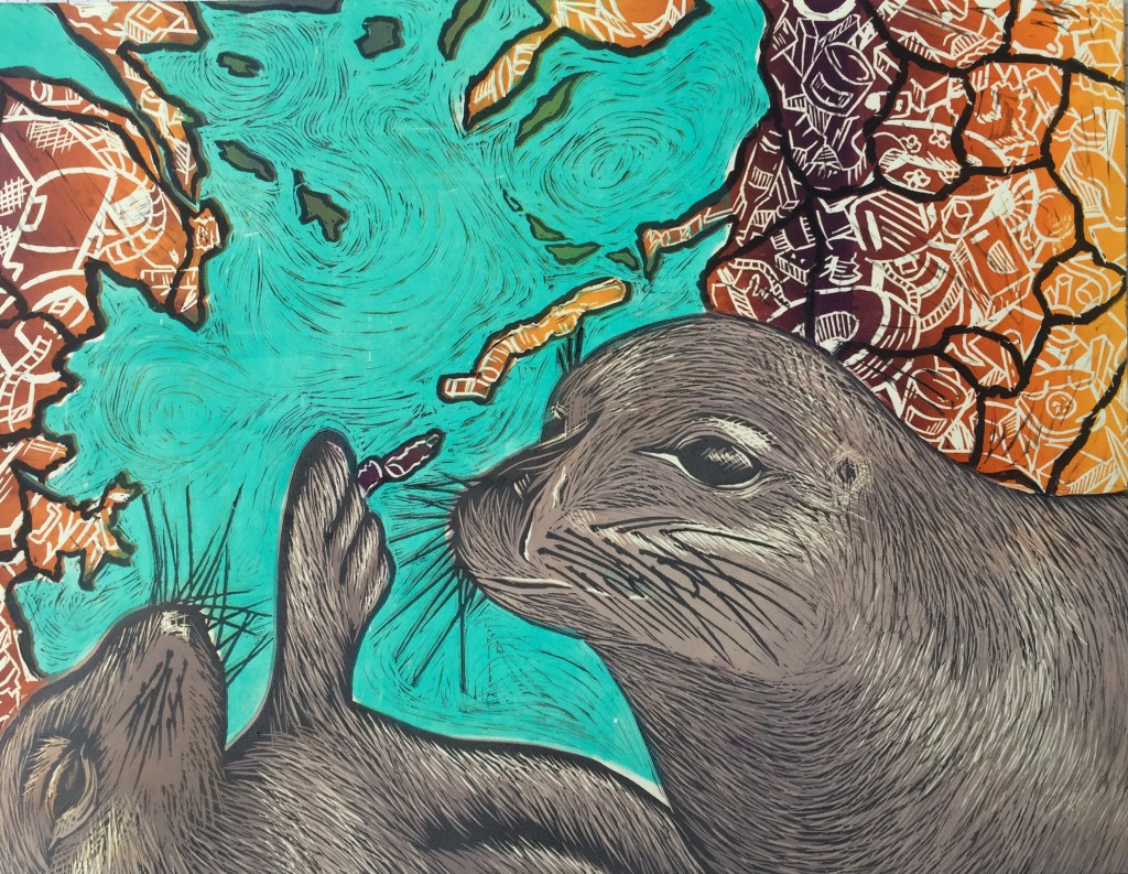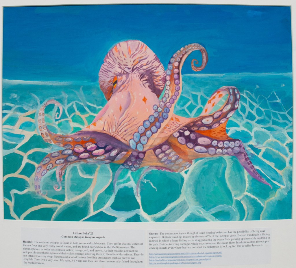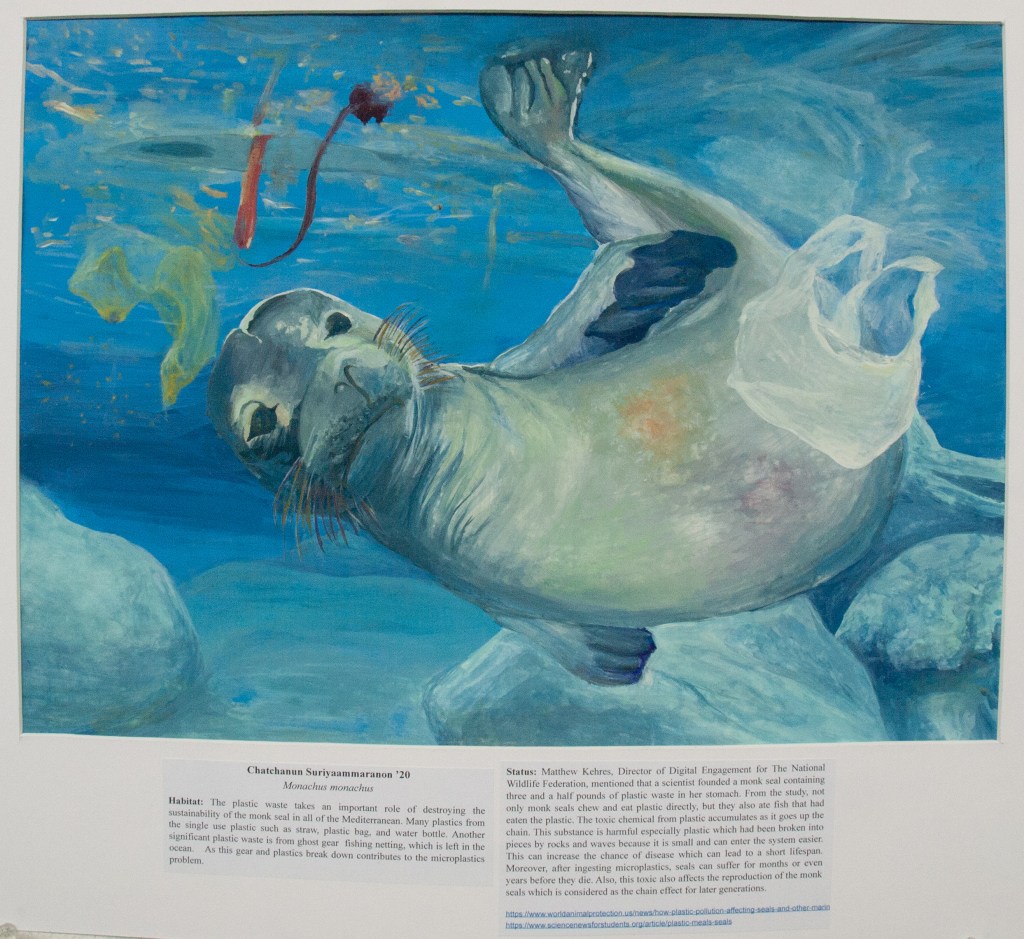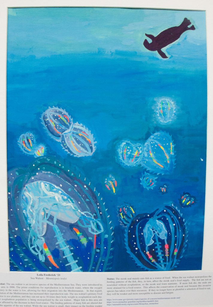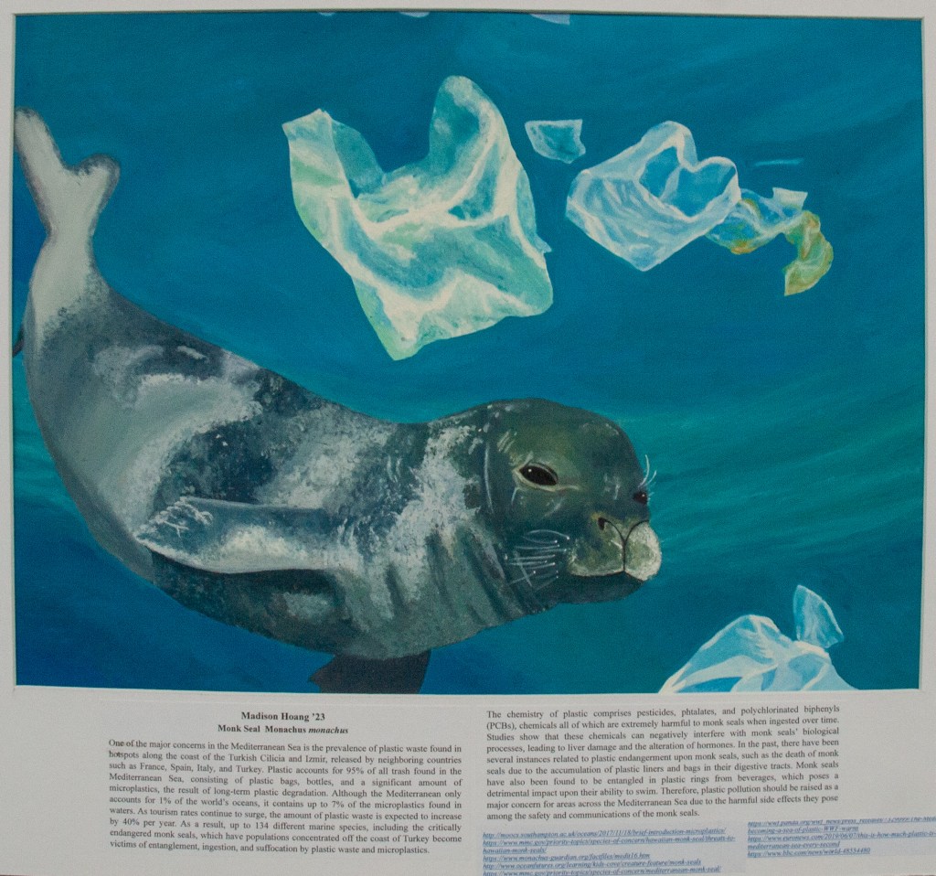 As a class we give profound thanks to Dr. Bundone because he had faith in our work and his passion for his own life’s work encouraged us to be better artists, students and humans. Dr. Bundone’s studies brought realism and accuracy to our work by answering specific questions for information about the Mediterranean monk seal to help us convey the ongoing situation occurring in the Mediterranean. The additional presence of scientific study inspired us as artists to create very accurate and informational pieces focusing on every angle, every shadow, and matching every color. We have had our fair share of struggles translating details from sketches to paint, conveying specific colors, finding how to make the presence of a shadow known, and blending colors. When our climate crisis seems less important than anything else, my generation must deal with these problems as those in power now ignore the scientific evidence. It is in our hands to make sure we have a future.