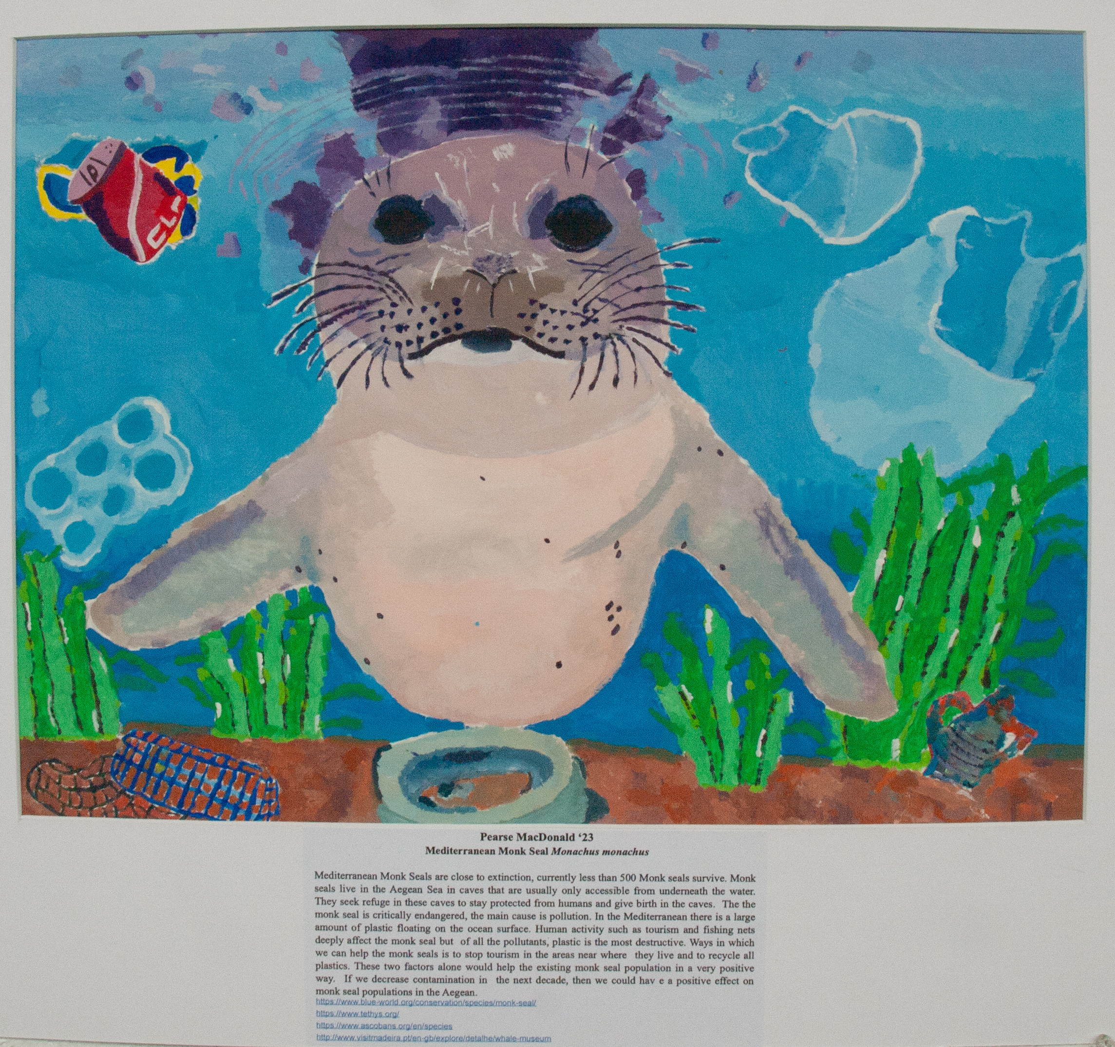 We were handed a task that was quite out of the ordinary: to research the Mediterranean monk seal. We did not initially understand the ambitious expedition we were soon going to embark on. In collaboration with Dr. Bundone, we immersed ourselves in the fight of our lives, the climate crisis, while still learning how to transform what we could see and our passion for this issue into our artwork. Throughout this project we learned a lot about ourselves as students and a lot about our role in the environment. This project was a testament to the skills we have acquired in our Studio 1 art course. Dr. Bundone’s studies engaged us deeply in our work: seeing his passion for his life’s work inspired us each time we lay a brush to our paintings. Though we were in collaboration with Dr. Bundone, we were also very independent. We learned to remain patient as we faced challenges to fix “mistakes” that were actually bright spots in our paintings in the end.