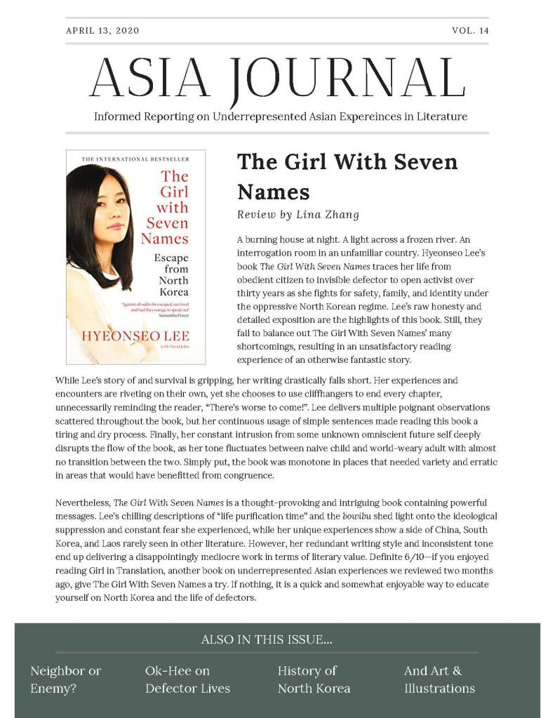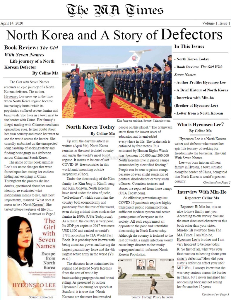 Editor’s Note: Students crafted these newspapers after reading The Girl with Seven Names: A North Korean Defector’s Story, and each newspaper contains five articles and two visuals. While a book review and a study of North Korea were required elements, students were able to choose from a list of other article types or design their own articles and visuals. Students had to tailor the writing in each article to fit five different nonfiction styles and tones while also presenting the information in a clean, polished final product.