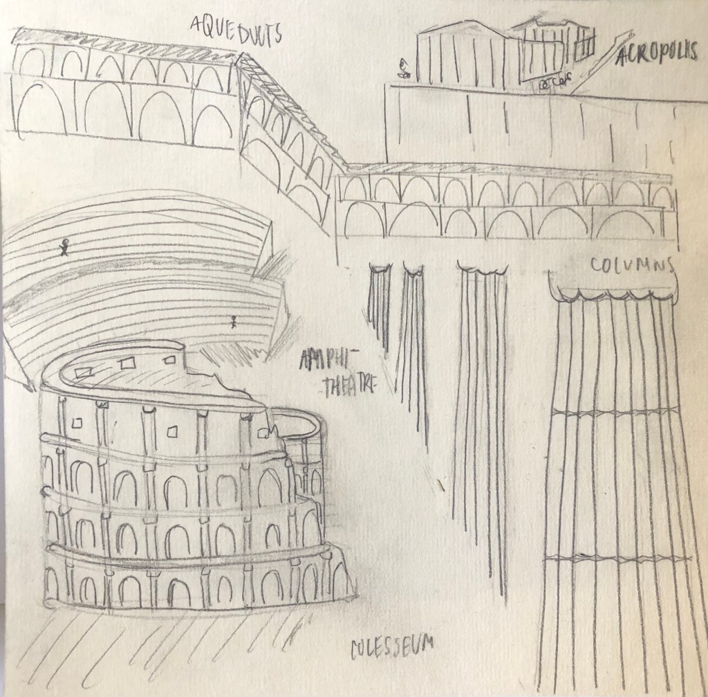 Standing tall in the right upper corner is the acropolis in Athens, a little off in the distance, a building well known and word that has developed into something more. The word meaning almost “city on a hill” has become a powerful phrase in the modern world. An image of a hopeful and more ideal government stems from one of the first-ever democracies. It has stood the test of time with strong standing Doric columns and represents the rich history of the Greeks. Running through and around the acropolis is a Roman aqueduct, the earliest form of water manipulation. The Roman harnessing of water represented the power of the empire and control over this life-sustaining resource showed an impressive knack for collective learning and complex ecosystem engineering. Columns stand tall along the right of the panel due to their lasting relevance to modern architecture. Made of individual stacked circular stones, these columns held up massive roofs and looked good while doing it, with impressive detailing when Ionic or Corinthian in style.