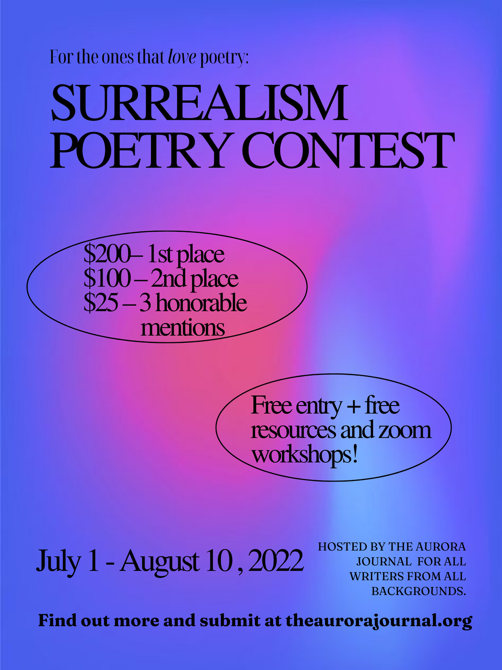 To accomplish the educational aspect of my contest, I contacted eight published writers and past Aurora Journal contributors from all over the world to co-host poetry workshops. Luckily, they got on board! I hoped these eight workshops would offer accessibility for those who can’t afford to attend expensive workshops or pay editors for feedback. Topics ranged from negative space to grounding techniques to dreams to prose poetry, where the hosts helped to create an environment where attendees could learn, ask questions, and grow as writers. We had live and pre-recorded workshops that garnered more than 700 attendees. The collective effort of the writers and attendees created a supportive and inclusive community where individuals could come together to learn, gain feedback, discover new genres and styles, and grow as poets. The workshops provided a platform for writers to connect, collaborate, and inspire one another, making it an interactive and memorable experience.