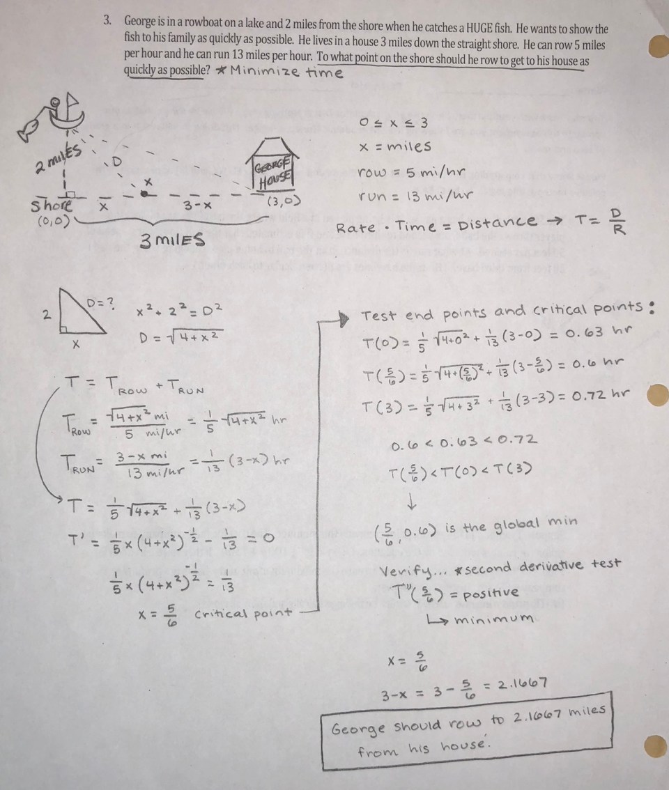 In this problem, George wants to minimize the time it takes for him to get home. Haley applied her understanding of derivatives to determine the exact spot on the shore where George should leave his rowboat before running home.