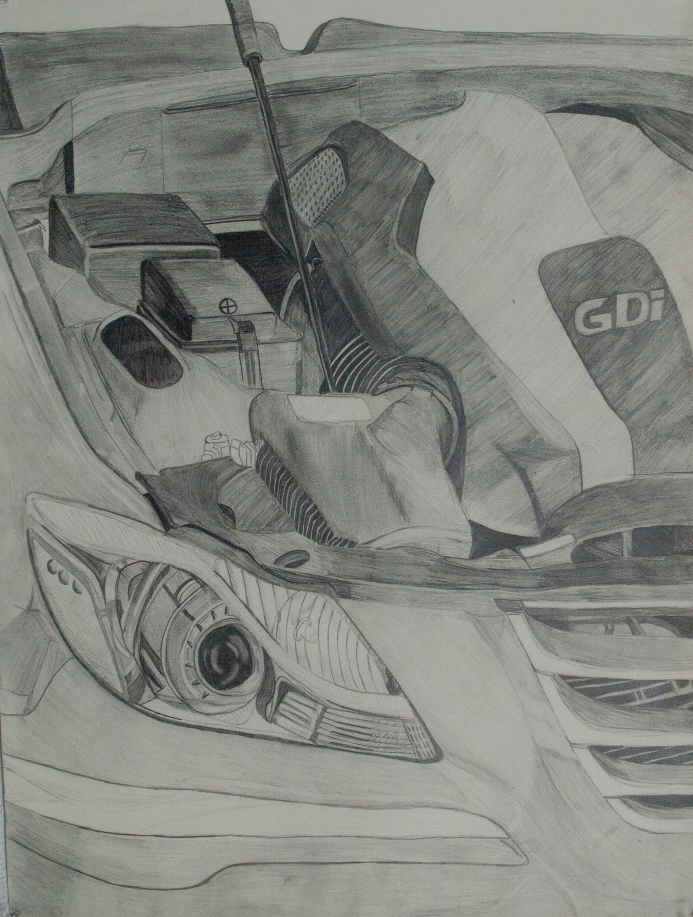 I completed four sketches this summer on 18 by 24 paper, with 2 on black paper in color and 2 on white paper in shaded pencil. I worked on it for Studio 3 this year as a IVth Former. It was a concentration on globalization and how I defined it. I define globalization as the interconnection of ideas, people, and places. It’s like social networking for beliefs and worldly progress and history. I took things from my everyday life, in this case automobiles and their breakdown, and had to express them within the parameters of the assignment. The structure of a car, and how each part is from somewhere else and then put together to create something to take you anywhere else, is amazing to me.