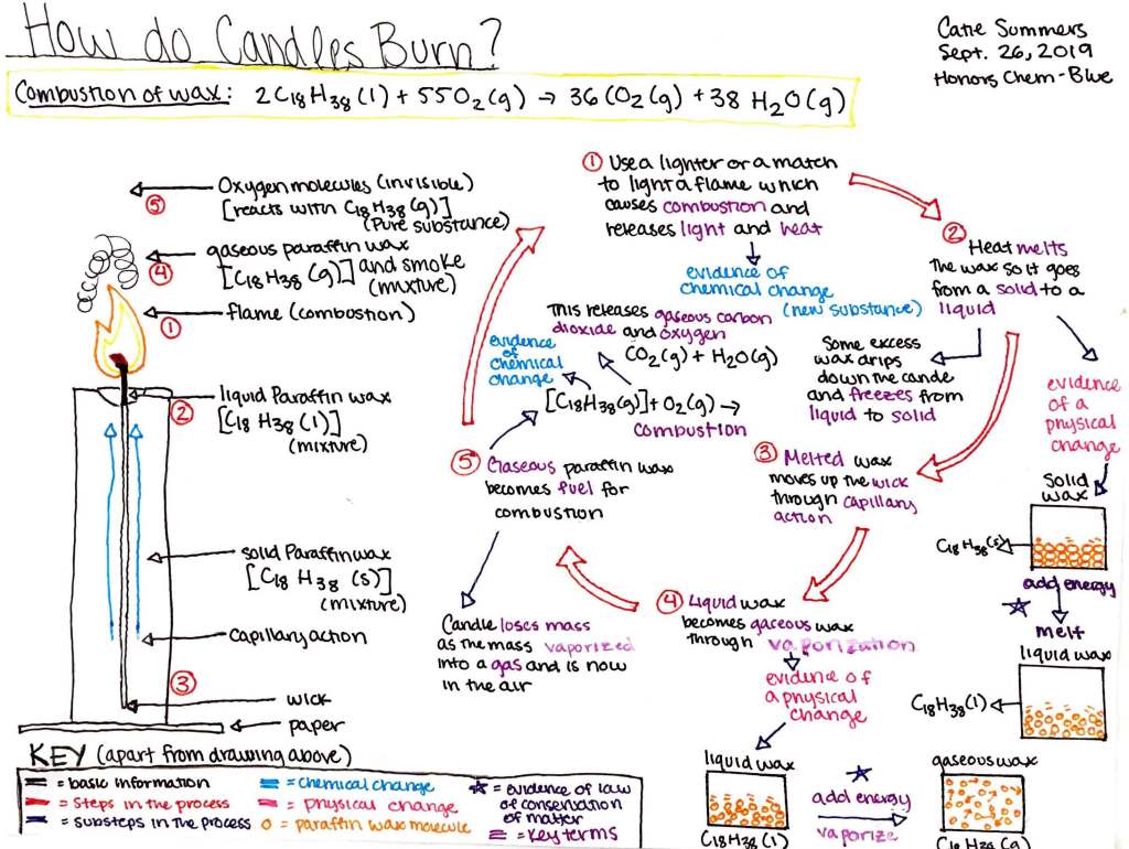 Teacher’s Note: In 1848, physicist Michael Faraday delivered a series of holiday lectures at the Royal Institution in London on the topic of “The Chemical History of a Candle.” During the lectures, Faraday used his observations of a burning candle as inspiration for relating, to a lay audience, a veritable encyclopedia of fundamental principles of physics and chemistry. In Honors Chemistry at St. Mark’s, we strive to recreate Faraday’s sense of wonder by performing simple experiments on a candle and interpreting the results in light, based on what we have learned about atoms, molecules, and chemical reactions. Students are challenged to determine the nature of a candle’s fuel and describe the process by which a candle’s flame perpetuates itself. In particular, Catie Summers’s eye-catching visual summary of this process reflects her efforts to link macro-scale observations with molecule-level interpretations.