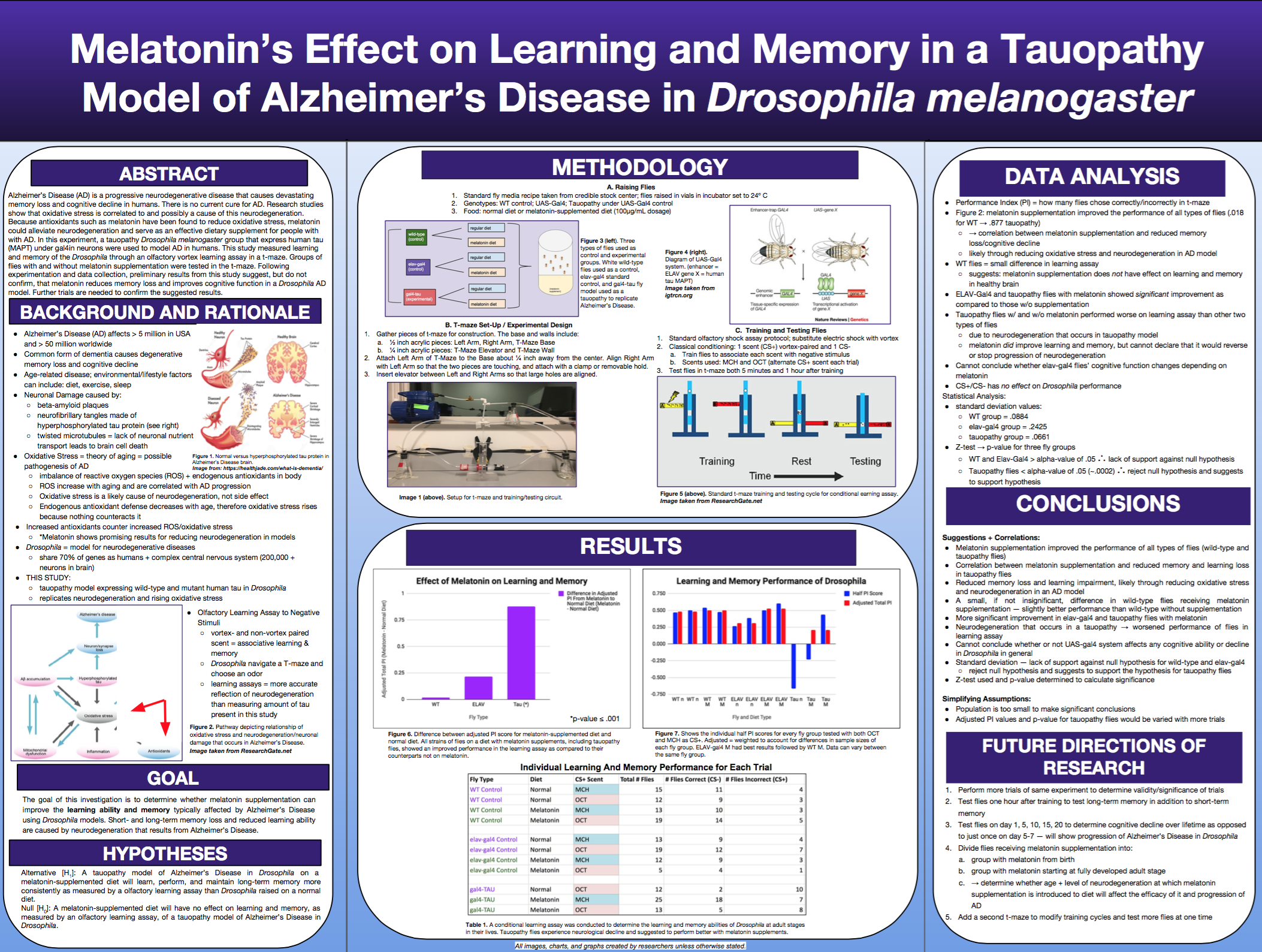 that express human tau (MAPT) under gal4in neurons were used to model AD in humans. This study measured learning and memory of the Drosophila through an olfactory vortex learning assay in a t-maze. Groups of flies with and without melatonin supplementation were tested in the t-maze. Following experimentation and data collection, preliminary results from this study suggest, but do not confirm, that melatonin reduces memory loss and improves cognitive function in a Drosophila AD model. Further trials are needed to confirm the suggested results.