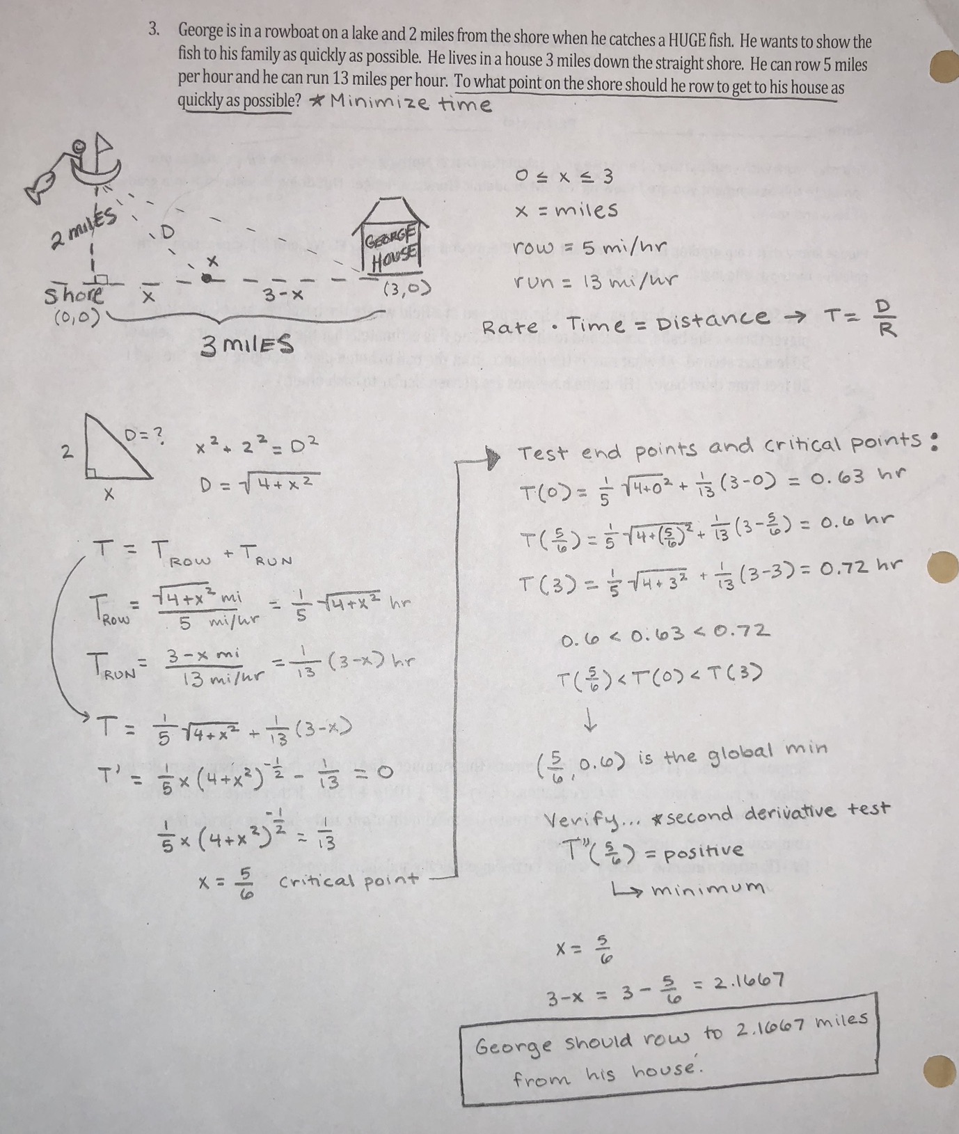 In this problem, George wants to minimize the time it takes for him to get home. Haley applied her understanding of derivatives to determine the exact spot on the shore where George should leave his rowboat before running home.