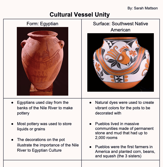 Instructor’s Note from Ms. Aggie Belt: Studying pottery from around the world teaches us about cultures far and near. Using the hand-building technique of coiling, students build a 10 inch tall vessel influenced from two specific cultures. From one culture they chose a form to reproduce, and from the other culture they chose a surface design to reproduce. Uniting these two cultures makes a unique vase. The Posters summarize their research and vases that informed their Unity Vase.