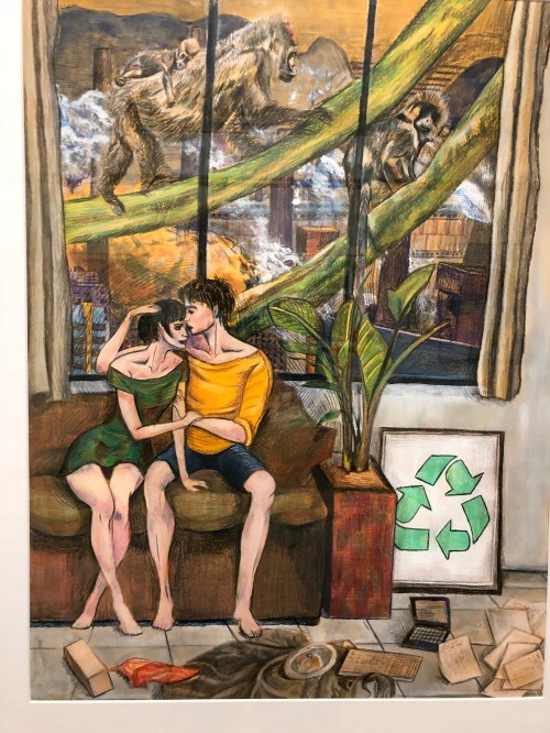 Made with color pencil and gouache (a type of paint) on bright orange paper, this drawing is called Two Worlds. It examines pollution, part of my concentration topic for my Studio III portfolio. I approached the subject from a third person perspective. Inside the apartment, a couple sits comfortably, while outside is a polluted world which animals have to escape. The depiction reveals a discrepancy between human and animals’ experience with pollution. We never realize the price the ecosystem paid for us to enjoy our daily conveniences, such as having electricity and running water. Additionally, since our general public regard pollution as distant and irrelevant, we often made little effort to change. Nevertheless, to accept a polluted world is our selfish decision, negligent of not only the future of humanity but also of the entire ecosystem. (more…)